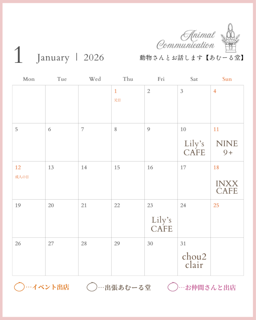 2026年1月のスケジュールです。来月も よろしくお願い致します。